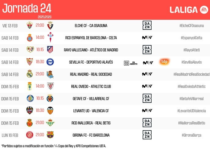 西甲第24轮时间: 2月15日4点皇马vs皇社, 2月17日4点赫罗纳vs巴萨